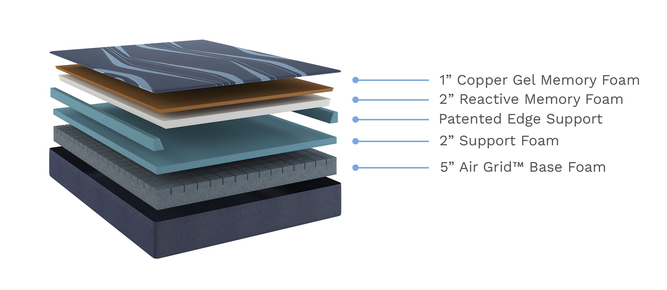 Copper is an essential mineral for the body's maintenance and recovery, known for providing energy and supporting the maintenance of blood cells and the immune system. The Reactive Foam provides a medium-firm spine-supporting feel with great bounce-back. Additionally, the Patented Edge Support System offers a stable sitting surface and 20% more sleeping surface, while the Air Grid™ provides articulated cuts for enhanced breathability and flexibility when used with an adjustable base.