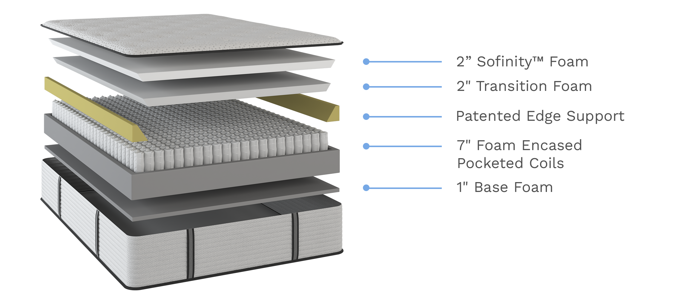 Experience revolutionary breathability, comfort and ergonomic precision with this expertly engineered mattress, the 12” Sofinity™ Hybrid Essentials. Inside the mattress the 2" layer of Sofinity™ Foam delivers next-level breathability with twice the airflow for cooler, more refreshing sleep, while the Patented Edge Support System expands your comfort zone with 20% more usable sleeping surface and stability from edge to edge. At its core, 7" Foam-Encased Pocketed Coils conform to your unique shape, reducing motion transfer and enhancing airflow. Wrapped in a soft Tencel™ cover that wicks away moisture and regulates body temperature, this mattress is designed to deliver ergonomic alignment, cooling comfort, and restorative sleepnight after night.