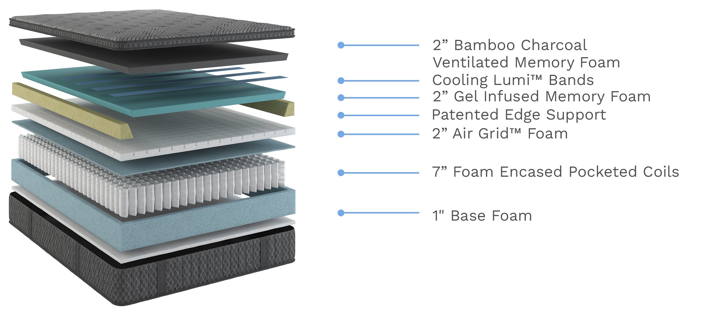 Breathable air channel layer to help dissipate heat. - 7" Foam Encased Pocketed Coils: Reduces