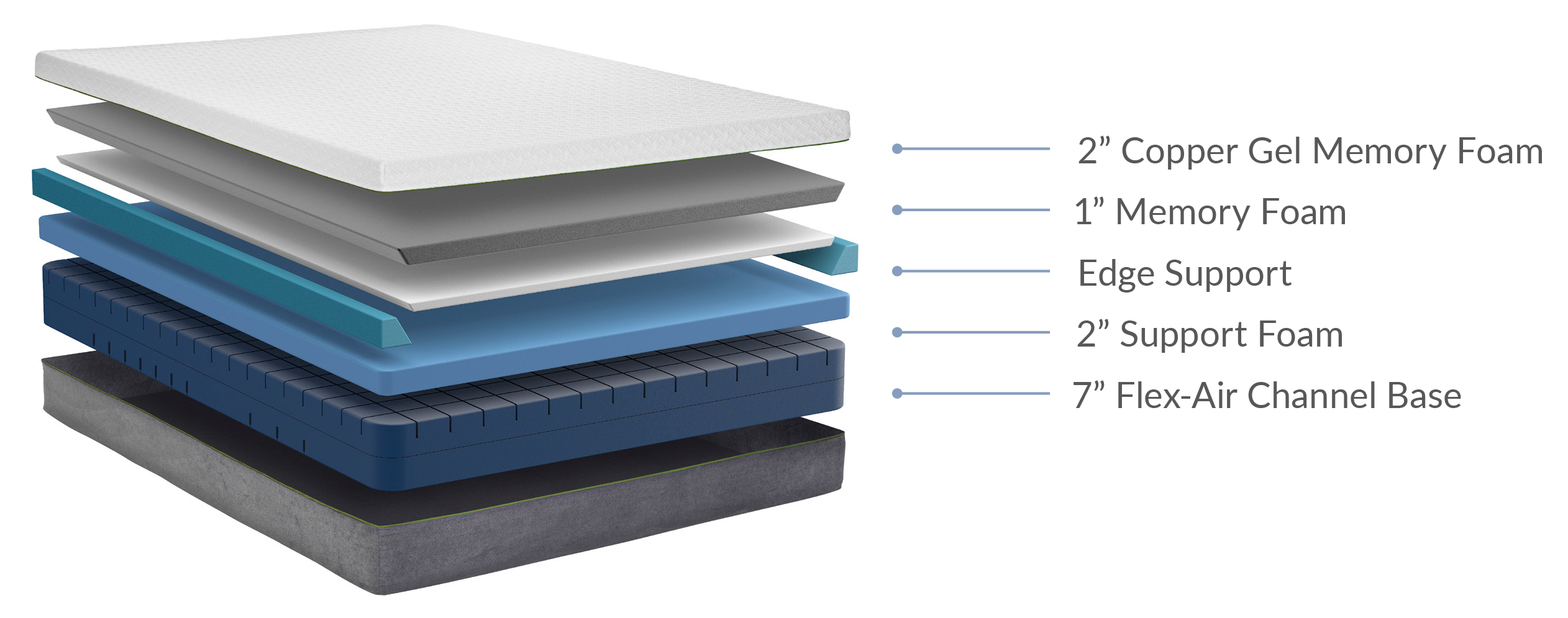 Copper is recognized as an essential mineral with health benefits like increased collagen production, energy levels, and iron absorption. The top layer of 2” Copper Memory Foam has antimicrobial properties that neutralize temperatures and dissipate odors. The 1” layer of Memory Foam prevents motion transfer, while the 2” Support Foam and 7”Air Grid™ Base work together to provide reinforced support for a longer-lasting mattress.